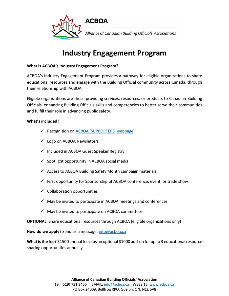 ACBOA’s Industry Engagement Program provides a pathway for eligible organizations to share educational resources and engage with the Building Official community across Canada through their relationship with ACBOA. For details regarding ACBOA’s Industry Engagement Program, please see below OR click here.